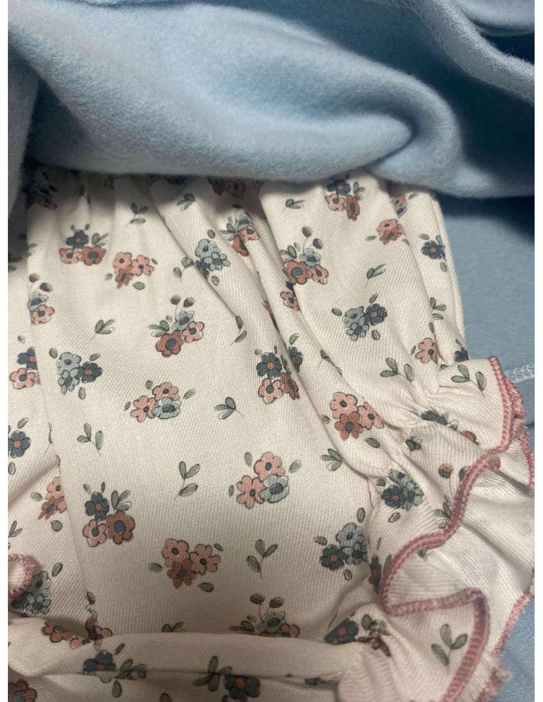 Conjunto de sudadera y braga, corte holgado con fruncido debajo del cuello, lo que le da una caída suave y un poco de vuelo. cuello y braga con estampado floral.