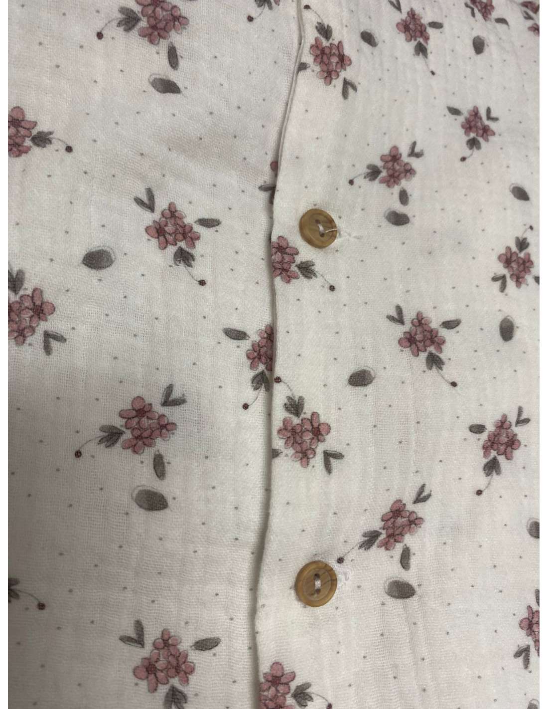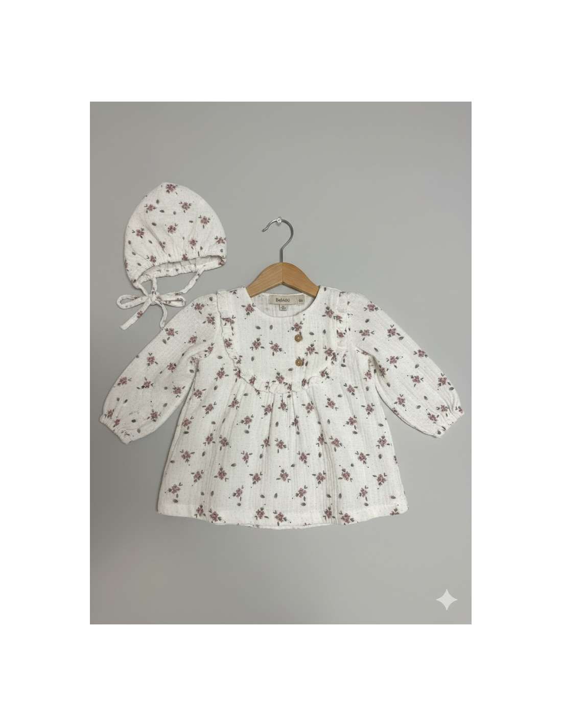 Es un vestido de manga larga con un corte empire (talle alto) y una falda fruncida que le da un vuelo suave. Se abrocha parcialmente con botones en la parte delantera.