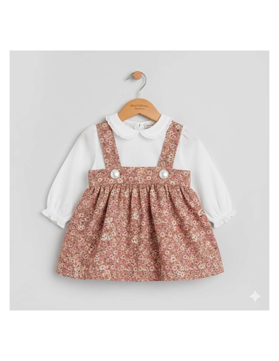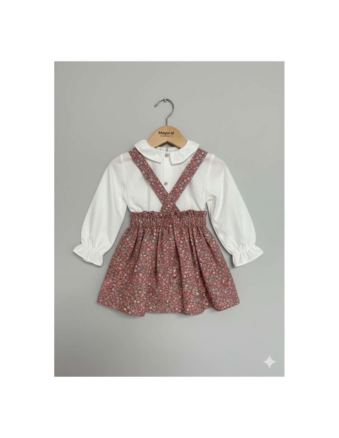 Este es un encantador conjunto de dos piezas (blusa y pichi/falda de tirantes) de estilo romántico y tradicional, ideal para la media estación o invierno.