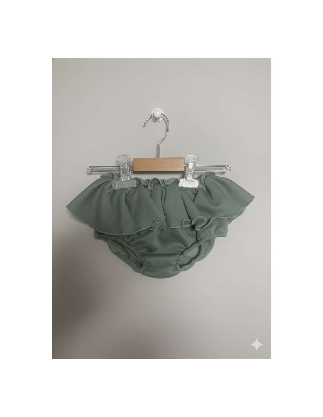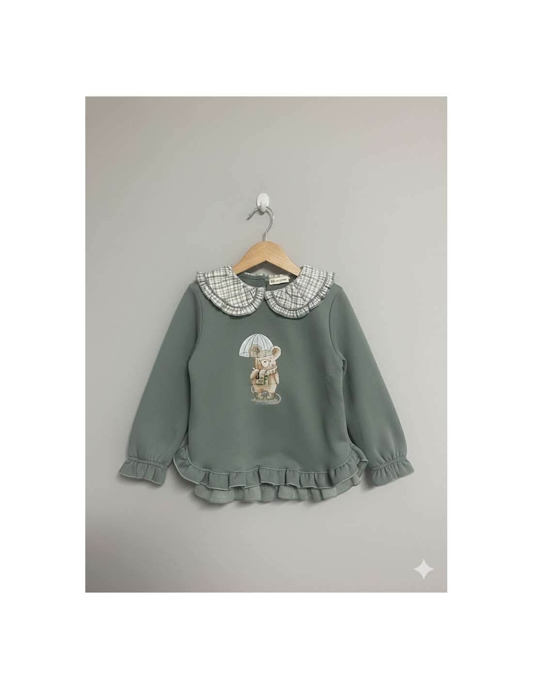 Este es un conjunto de dos piezas (sudadera y braga con volantes), de estilo infantil, clásico y abrigador, ideal para el otoño o invierno.