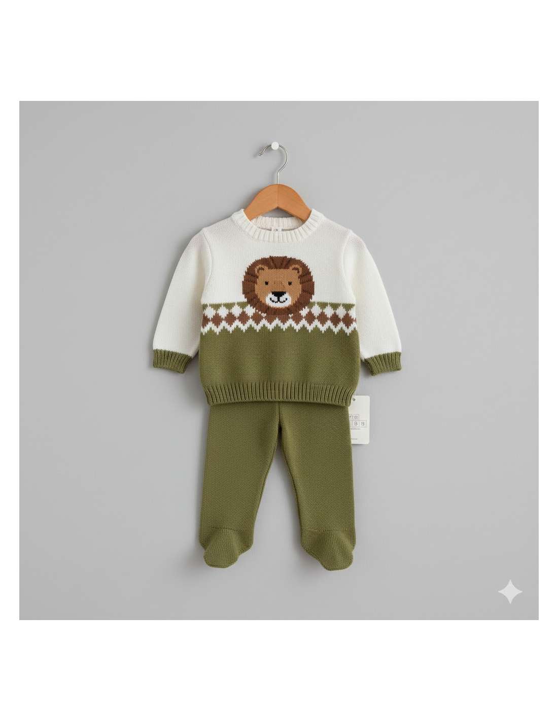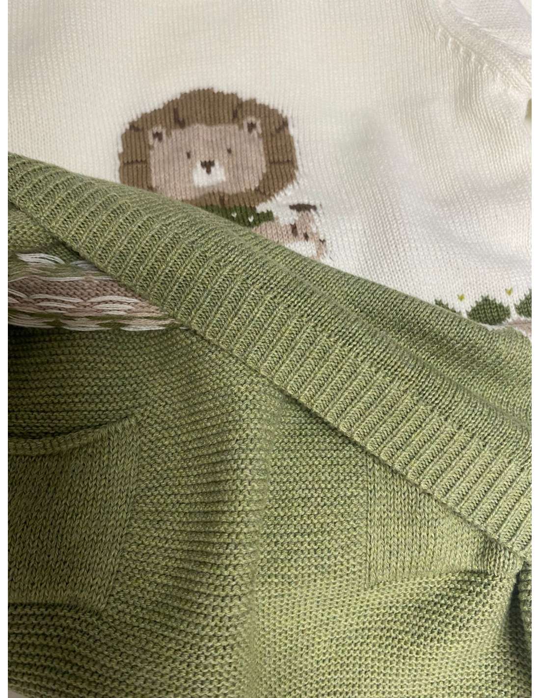 Este es un encantador conjunto de dos piezas de punto (jersey y polaina/pantalón), ideal para mantener al bebé abrigado en otoño o invierno.