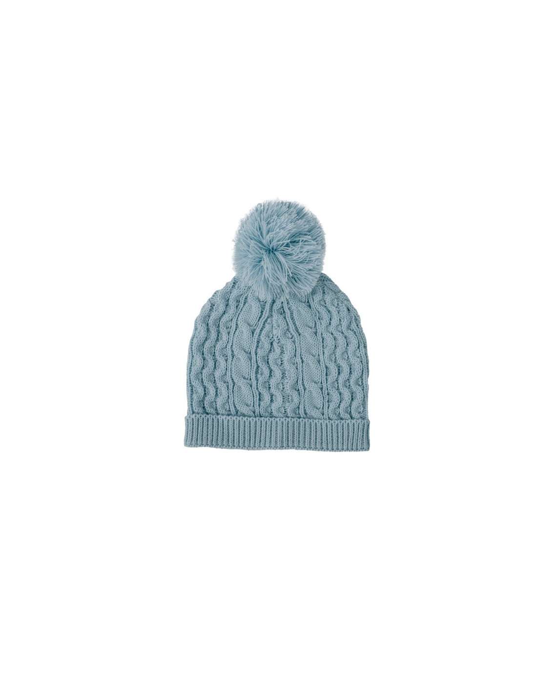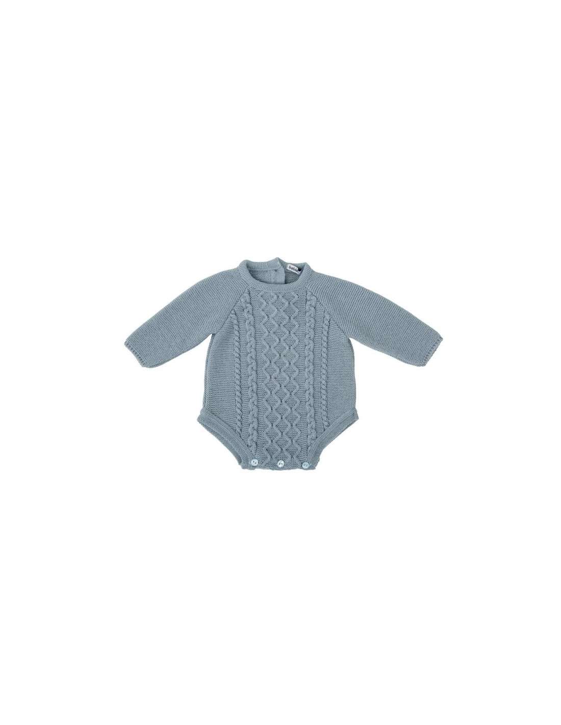 Conjunto de dos piezas para bebé compuesto por jersey verde de punto con diseño de ochos y botonadura lateral en madera, acompañado de un cubrepañal con borlas decorativas. El look se completa con un gorro de punto a juego con pompón, aportando abrigo y un encanto especial para los días fríos.
