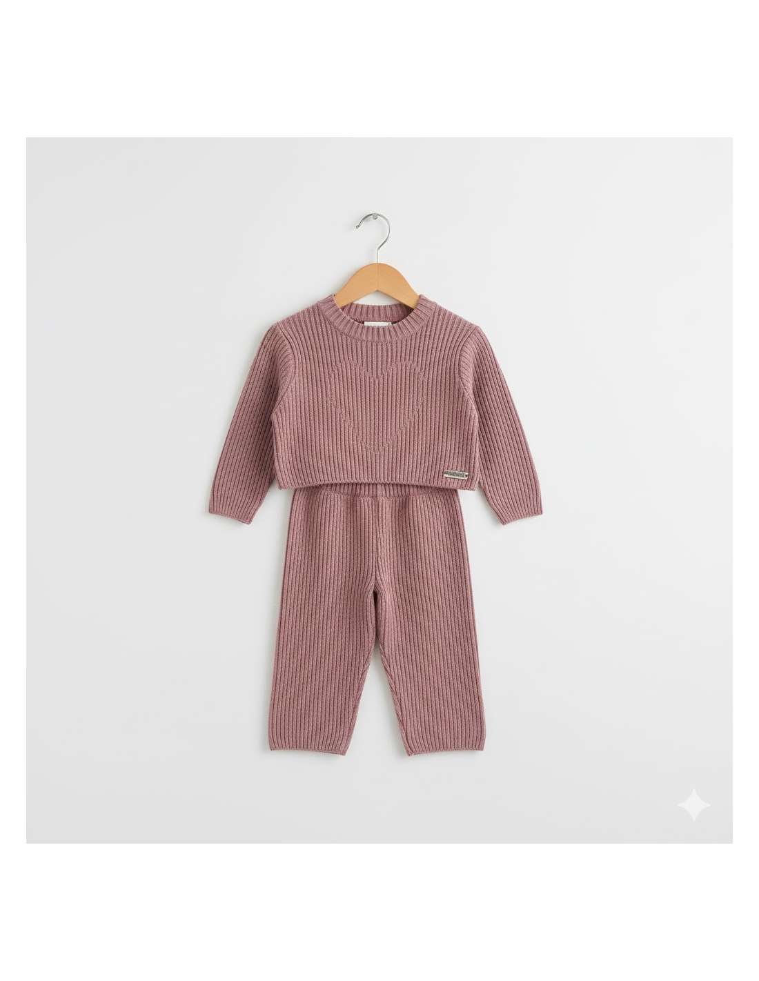 Este es un conjunto de dos piezas (jersey y pantalón), confeccionado en punto y con un estilo moderno y muy cómodo, ideal para niños/as.