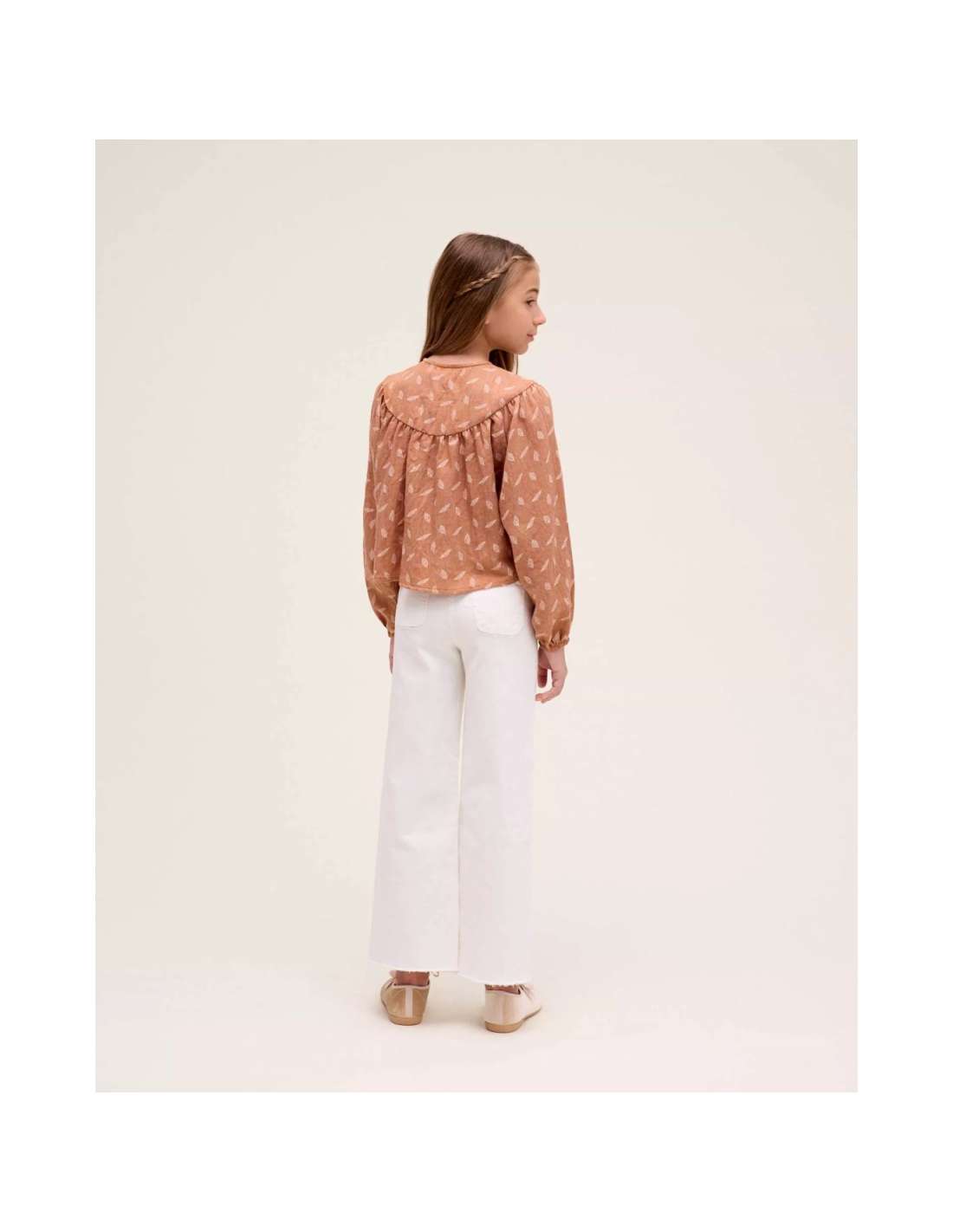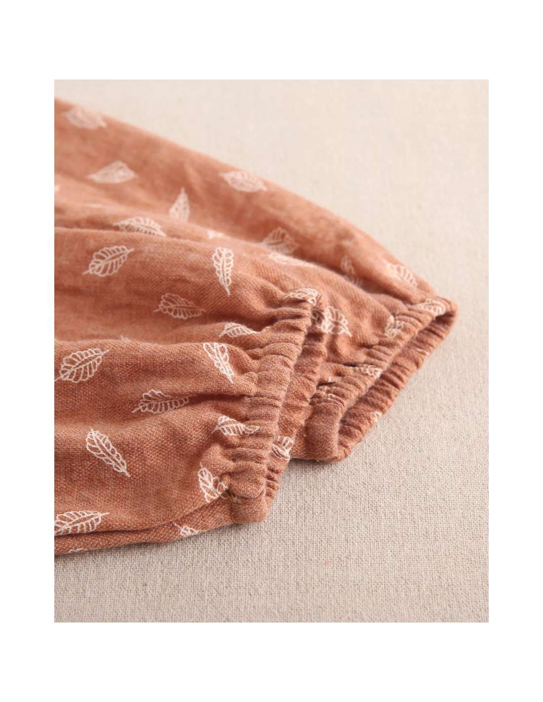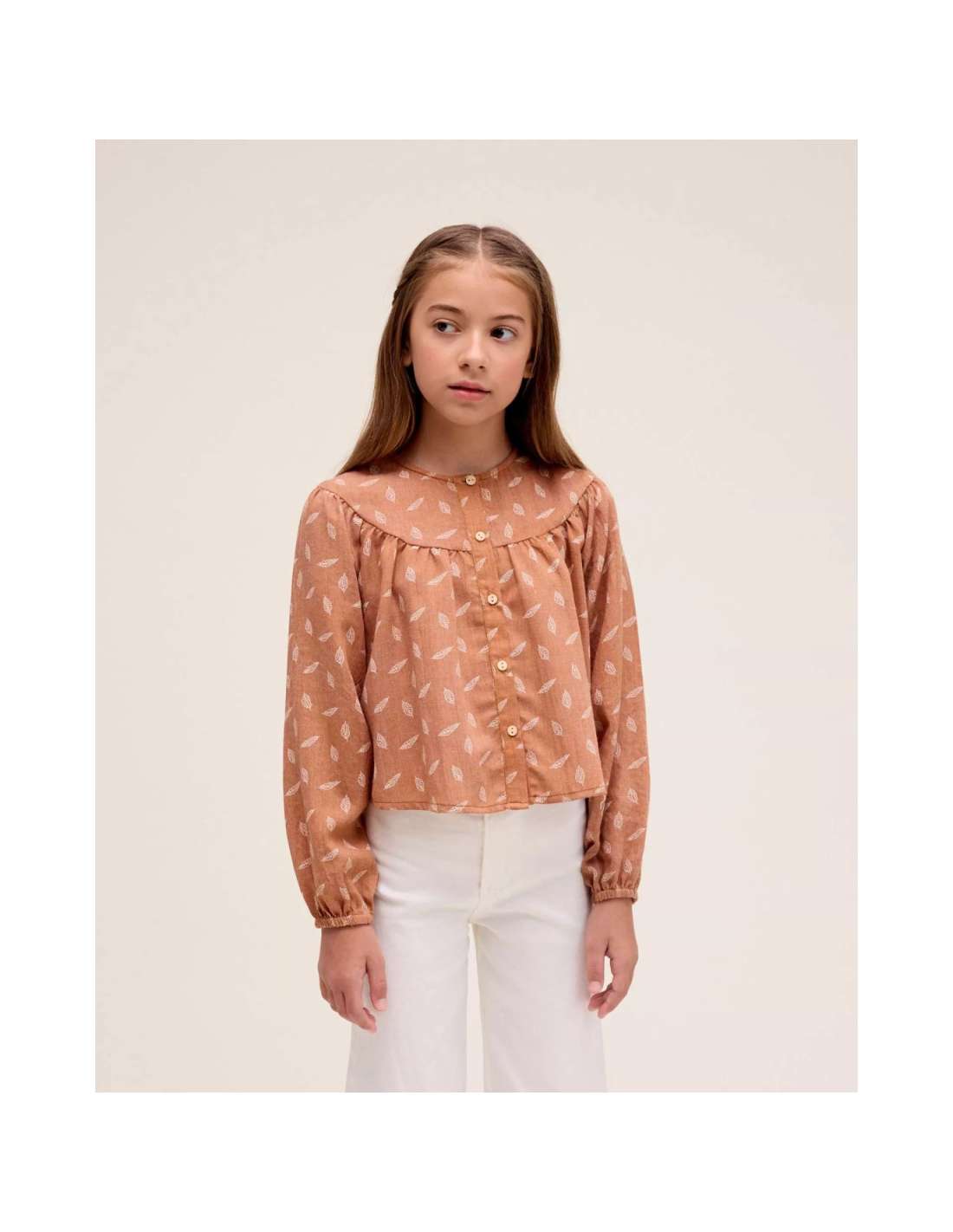 Blusa de niña naranja con estampado de hojas blancas, manga larga, cuello redondo, puño elástico y cierre delantero con botones de madera.