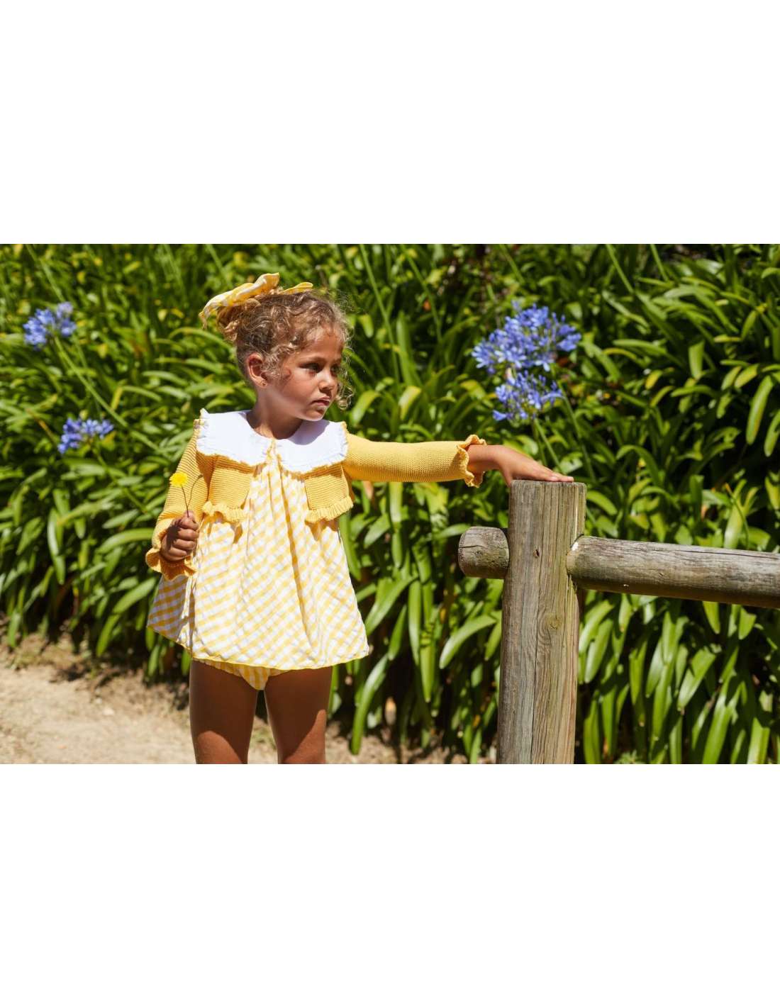 Un tejido de vichy con este amarillo tan especial, combinado con un cuellito blanco rematado con diente de rata y puntada al tono.