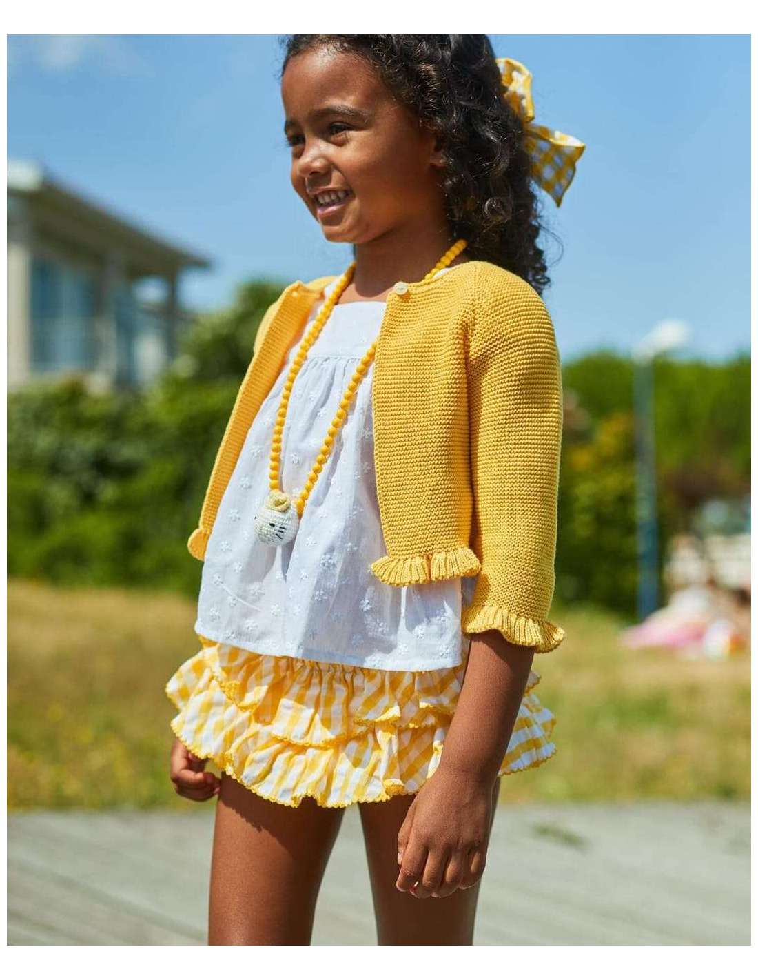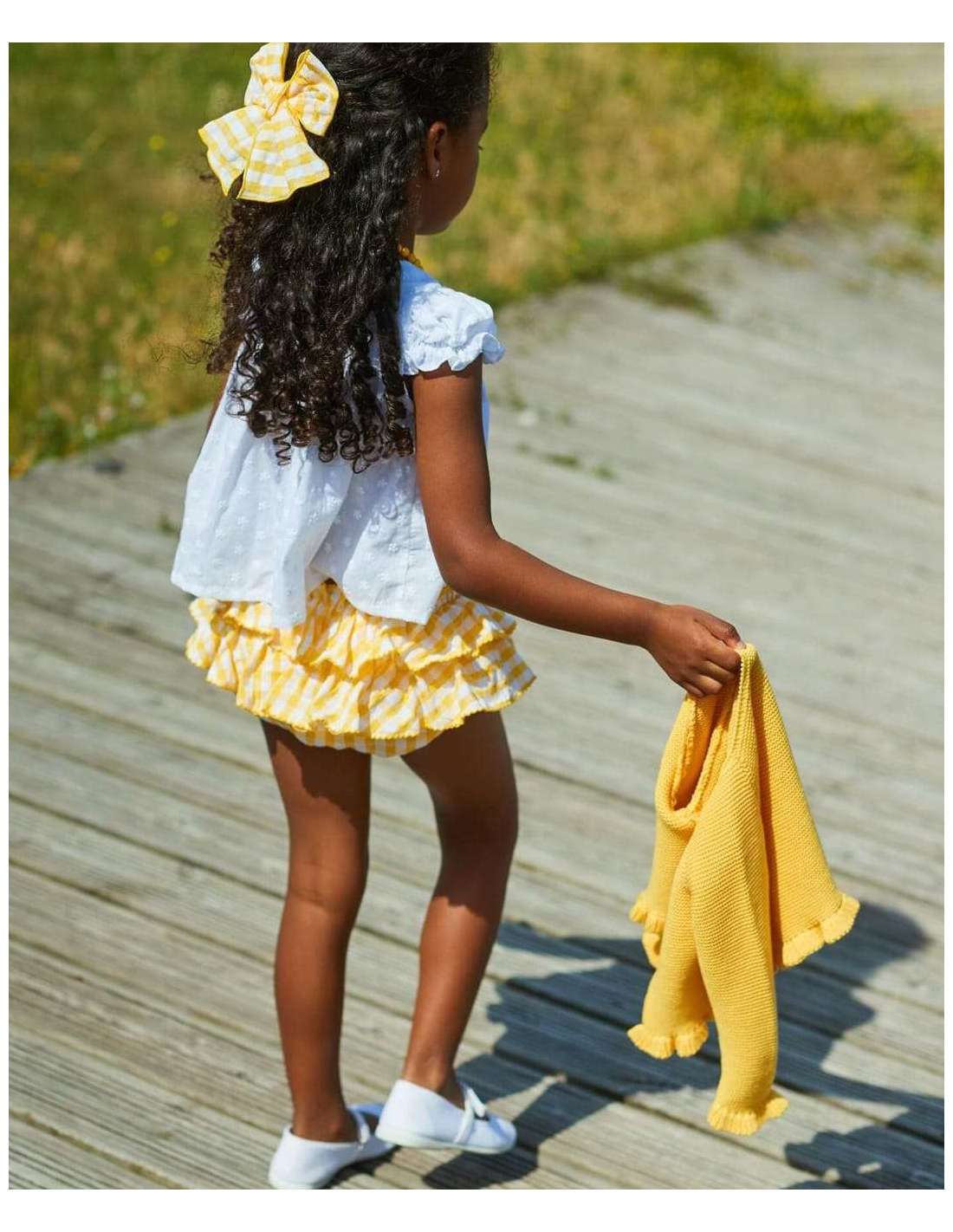 La niña con braguita de vichy amarillo acabada en diente de rata en los volantes, blusita con bordado de florcita .