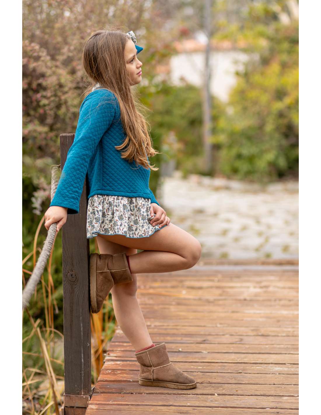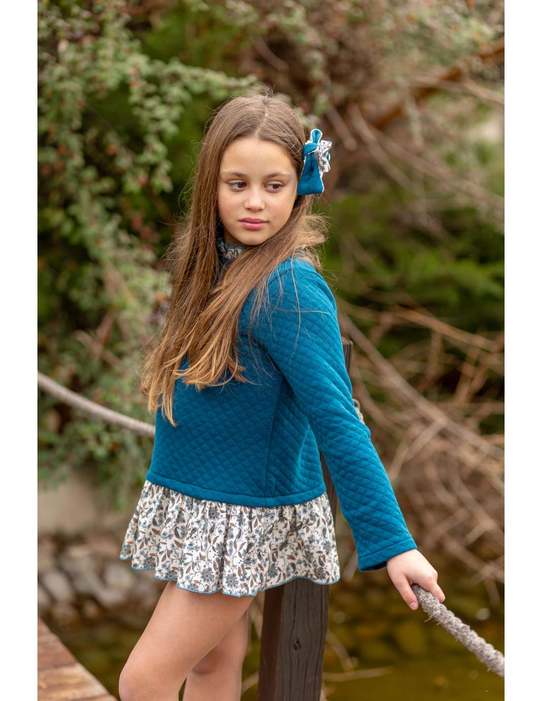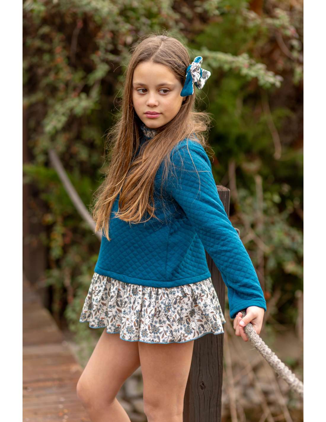 Vestido que combina texturas y estampados, tela acolchada y con rombos ,cuello y falda con estampado floral ,ideal para un look de entretiempo o invierno suave.