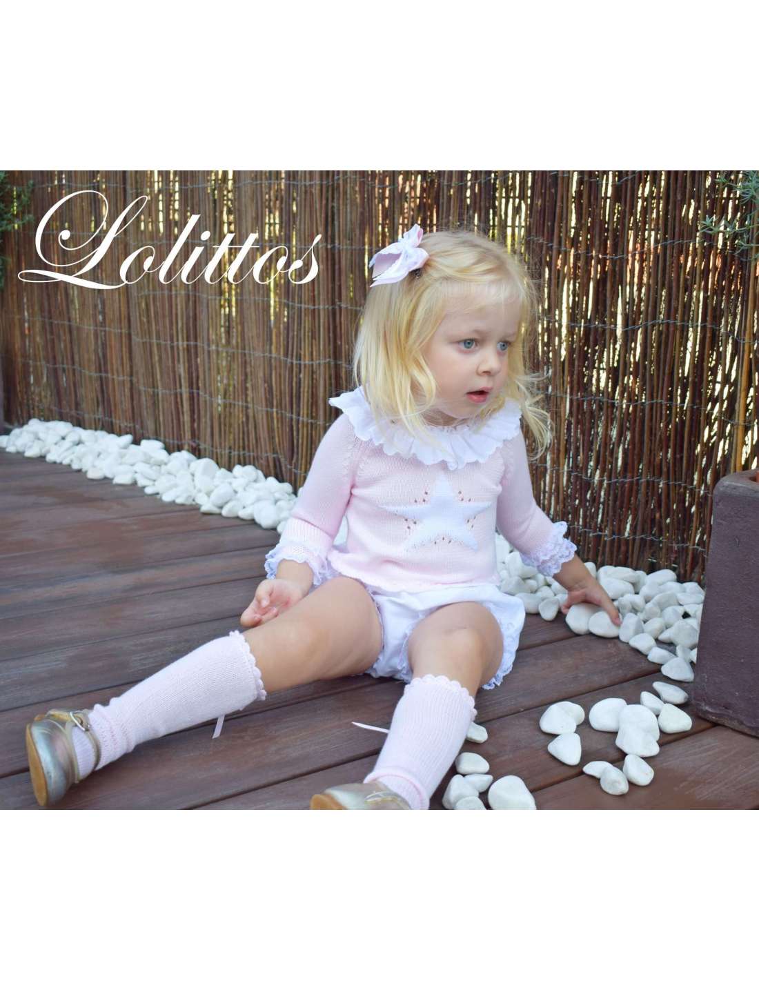 Jubón rosa con cuello bebé y estrella tejida en blanco, el cubre es de tela blanca con topitos rosas.