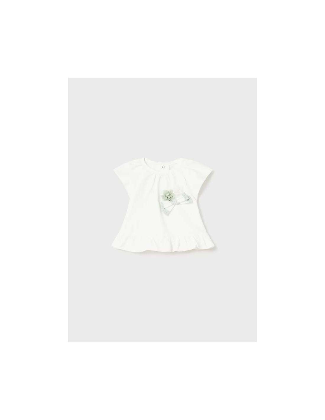 Camiseta para recién nacido. Cuello redondo. Cierre con botones a presión en la parte posterior para facilitar la puesta de la prenda. Diseño con volante decorativo en el bajo de la prenda.