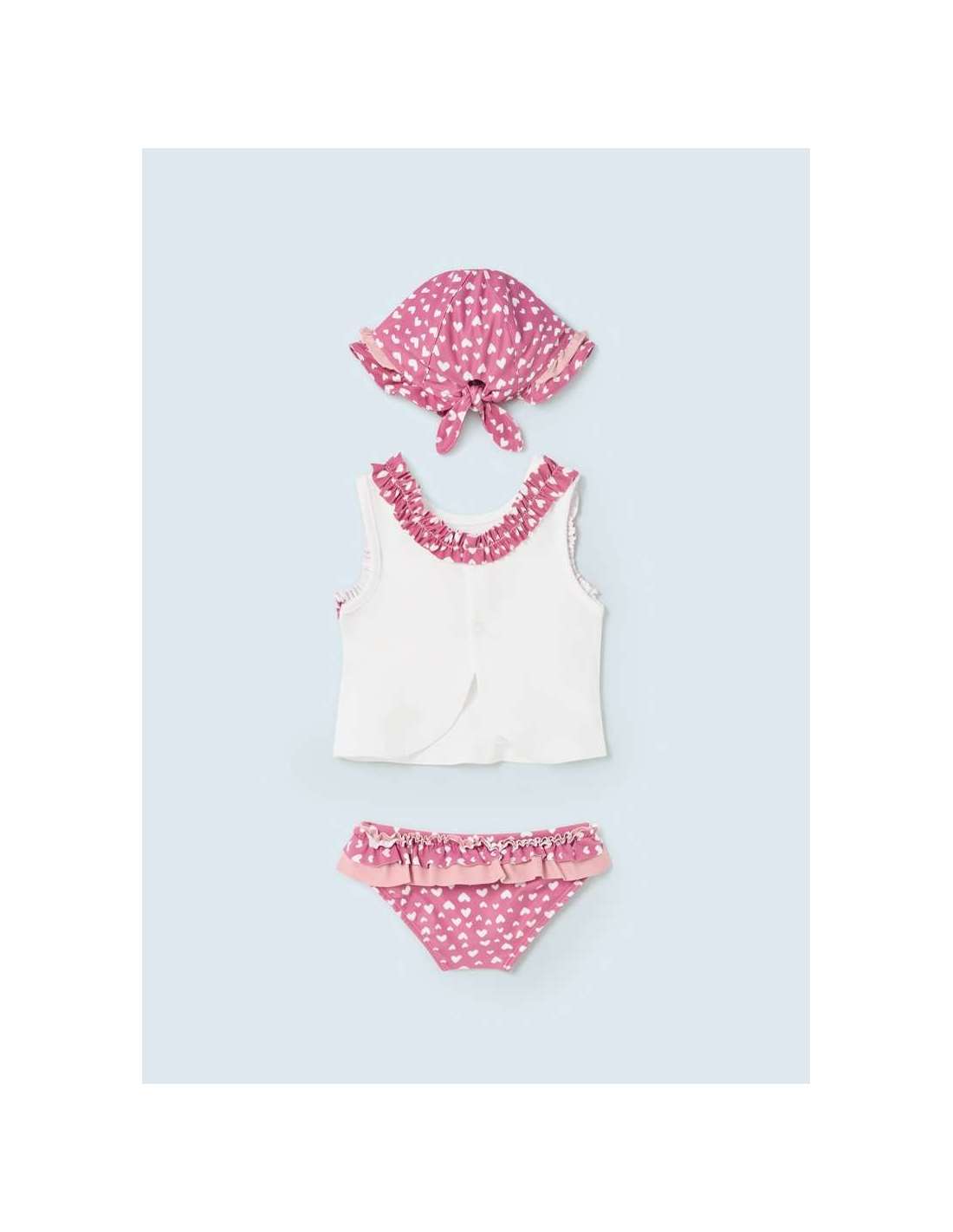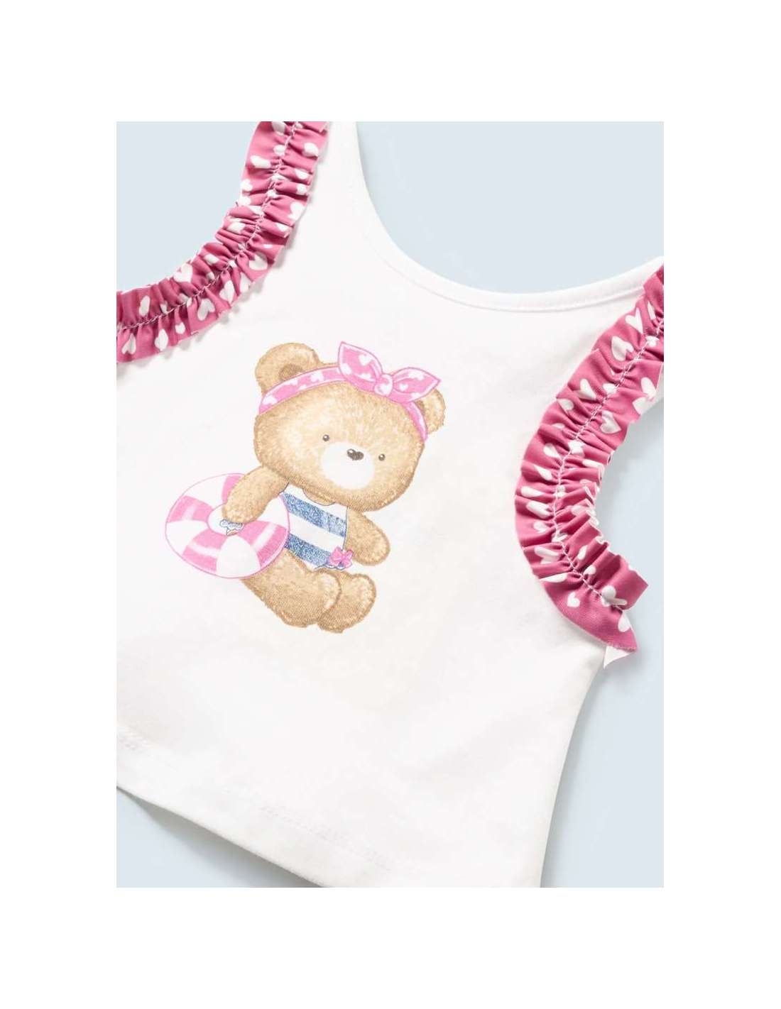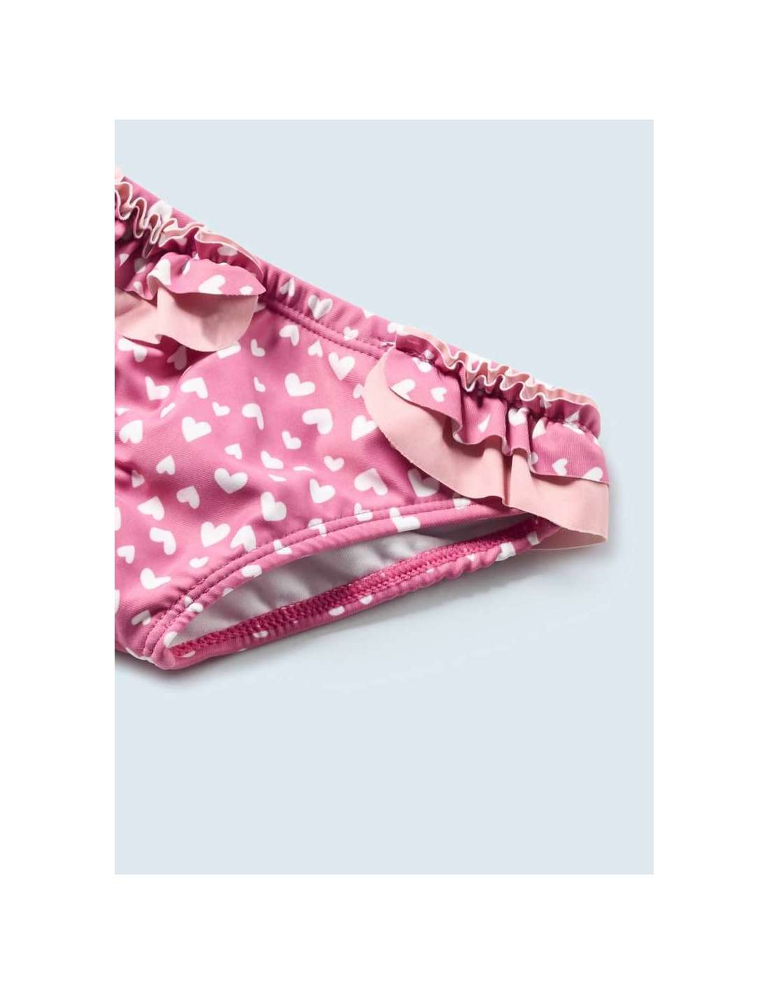 Bañador de tipo culetín para recién nacido. Elementos de adorno: volantes decorativos.